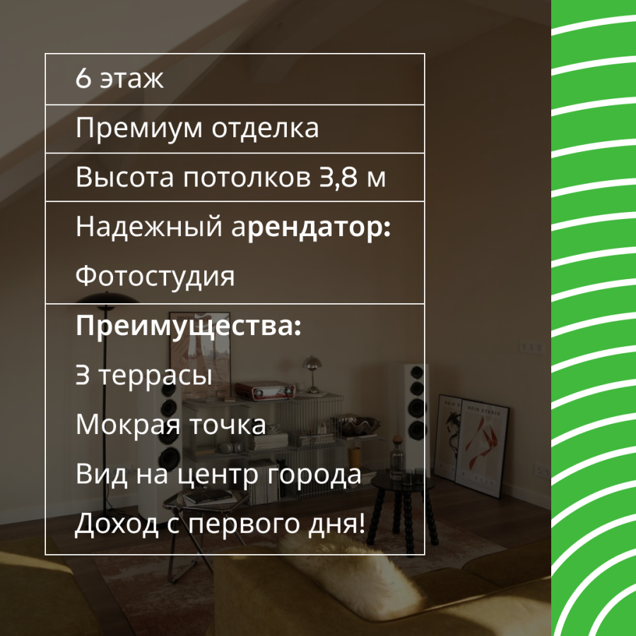 Арендатор — фотостудия. Профессиональный, стабильный, с понятной бизнес-моделью. Такие арендаторы ценят локацию, свет, высоту потолков и террасы.